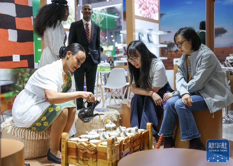 ↑ 11月7日,人们在第八届中国国际进口博览会国家展埃塞俄比亚馆品尝咖啡。新华社记者 孟晨光 摄