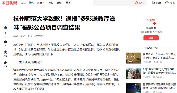 该课题来自今日头条精选项目。海报新闻记者冯伟成报道。简单的事情如果造假就会变得复杂,而变得复杂的不仅仅是事情,还有解决这个事情的方法。抄袭扶贫公益金清单事件曝光后,杭州师范大学仅一天时间就发布了情况报告,列出了45万公益金的去向。但如果受益人名单可以编造出来,整件事的调查又怎能止步于自查自纠呢?也就是说,学校可以把这45万新台币的公益金列为1、2、3、4、5来明确解释吗?如果之前的受益人名单没有公布,那么真正的名单什么时候公布呢?备受关注的45万元资金是否应该单独核查落实?价值15万的书架、价值10万多元的学习用品、书5万元以上,路费4万元以上。是不是每一项费用都产生了?价格公道吗?这些物资真的送到学生手中了吗?当收款人最基本的信息都可以被伪造时,人们如何相信后续步骤中的账单、合同和承兑单的真实性?简单的事情如果造假就会变得复杂,而复杂的事情没有简单的解决办法,也不是一朝一夕就能彻底弄清楚的。因此,此次事件的调查处理不应停留在杭州师范大学的“自查自纠”层面。项目审批单位、审计部门乃至上级学校部门应发起更有力、完全独立的第三方调查。此类“姓名百科”诈骗已不再是孤例。这既反映了一些单位形式主义、敷衍了事的问题,也反映出不合规的发生率太低。如果每次发生事件,相关单位都能通过内部自查、自定责任、不言自明的“情况说明”轻松过关,那么造假的诱惑就永远存在。只有通过密集、公开、透明、不留盲点的调查,才能查明真相,找回失去的公共利益凭证,对潜在的类似行为形成强有力的震慑。