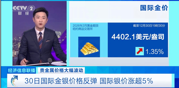 受芝加哥商品交易所昨日开始上调金属期货履约保证金等因素影响,在新规生效前大量投资者急于抛售。 29日,国际贵金属价格大幅下跌。今日(30日),国际金银价格上涨。北京时间今日晚上7点30分,纽约商品交易所明年3月交割白银期货价格报74.42美元/盎司,涨幅5.62%;纽约商品交易所明年2月交割的黄金期货价格为每盎司4402.1美元,上涨1.35%。此外,今日(30日)国际铜价也出现反弹。纽约商品交易所明年3月交割的铜期货价格调整为每磅5.6945美元,涨幅为2.30%。来源:央视财经